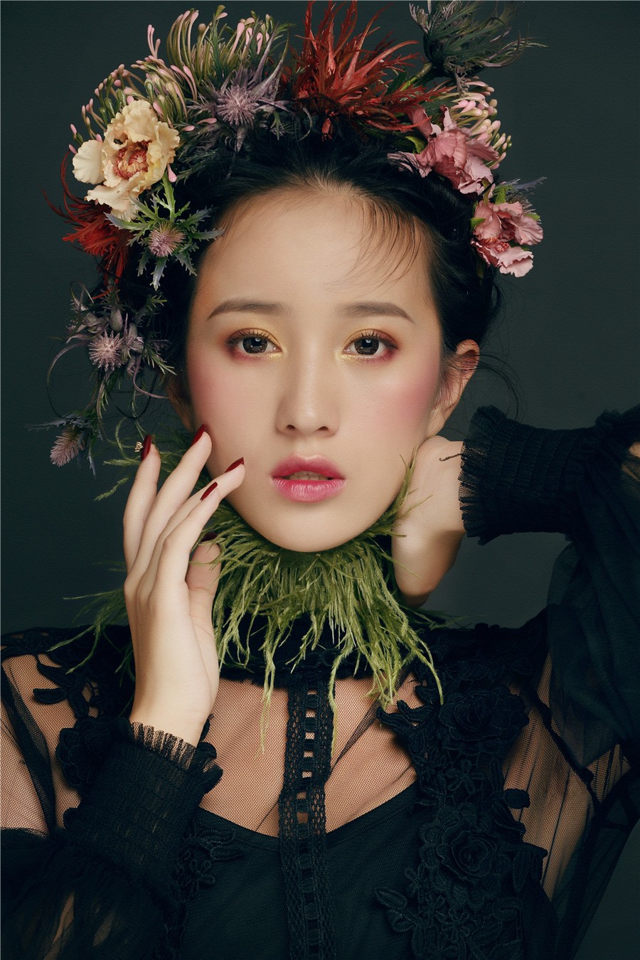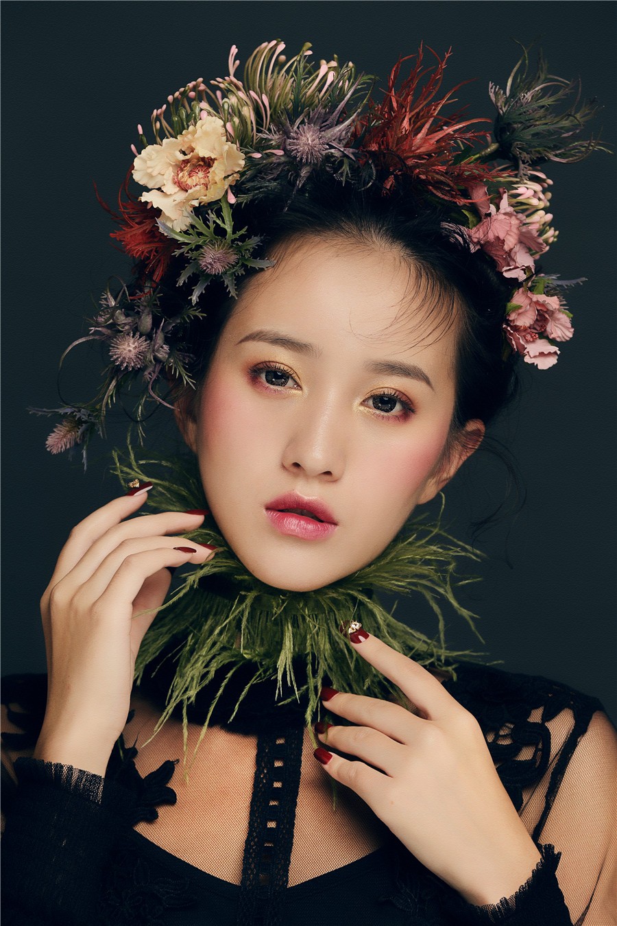 麗竹學(xué)校彩妝作品--復(fù)古油畫(huà)風(fēng):飽滿濃郁的妝面色彩,配以仙氣十足森系田園風(fēng),搭上靈動(dòng)的發(fā)絲在陽(yáng)光下跳躍,營(yíng)造出了一種別樣的浪漫氣氛,宛如華中走出的女子。