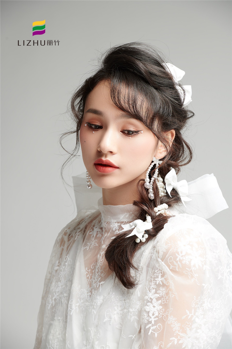 廣西化妝培訓(xùn)學校(麗竹化妝學校)---甜美時尚新娘造型:簡約的便面編發(fā),搭配優(yōu)雅的白色蝴蝶結(jié)點綴。素雅動人,甜美優(yōu)雅,無須濃墨重彩,即可打造氣質(zhì)恬靜新娘。