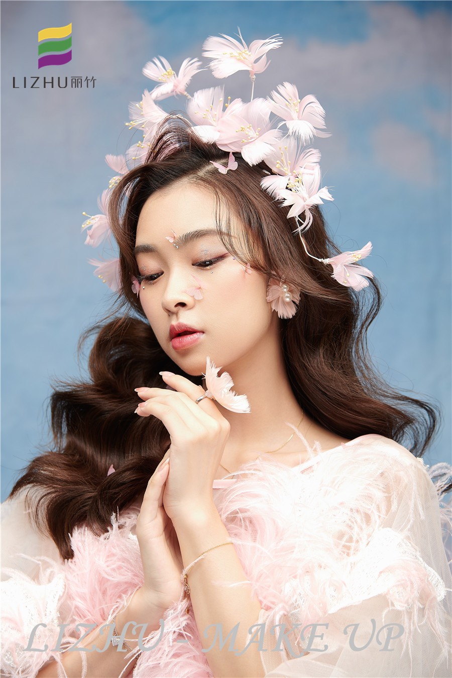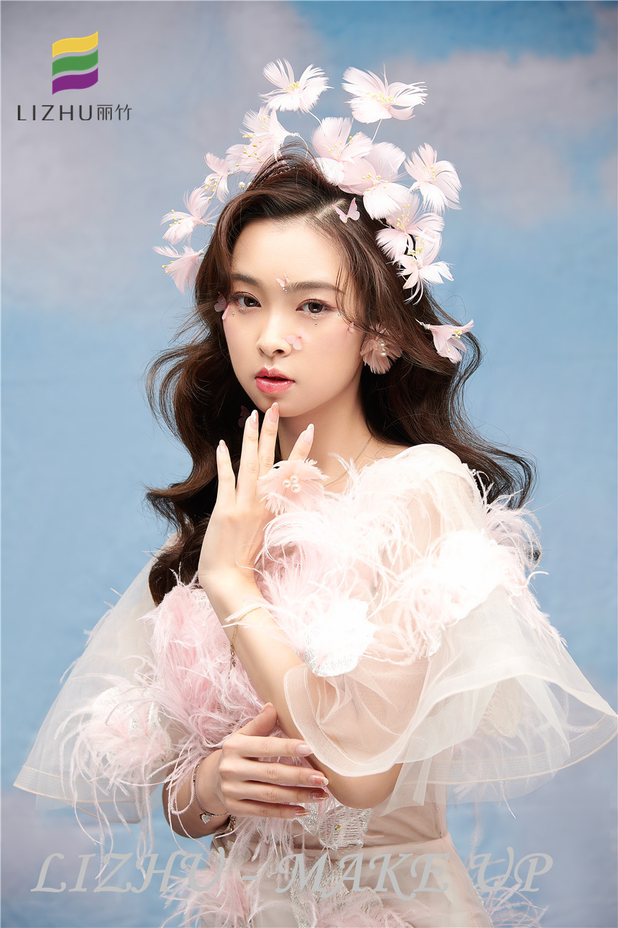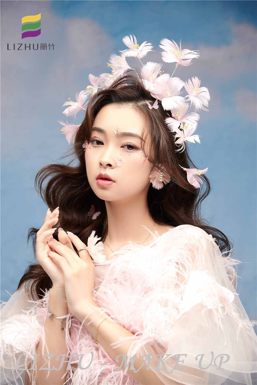 南寧化妝職業(yè)培訓(xùn)學(xué)校、南寧化妝培訓(xùn)學(xué)校排名、南寧化妝學(xué)校十大品牌分享:優(yōu)雅清新的披發(fā)造型,搭配粉色羽毛頭飾與紗群,粉色蝴蝶視頻點綴妝容,整體甜美又仙氣飄飄。