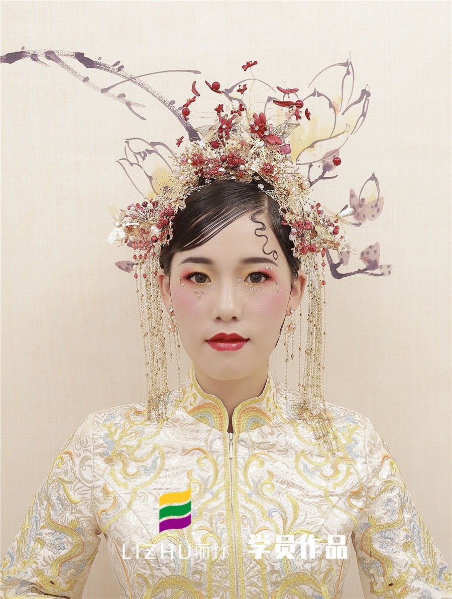 南寧化妝學(xué)校分享:裊娜少女羞,歲月無憂愁,中式新娘驚艷的一抹刺繡,精致典雅,演繹中國風(fēng),優(yōu)雅的盤發(fā)搭配精致的發(fā)飾,一身華服,正是芙蓉不及美人妝。