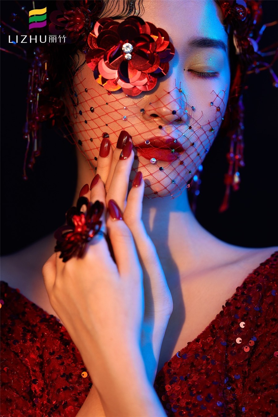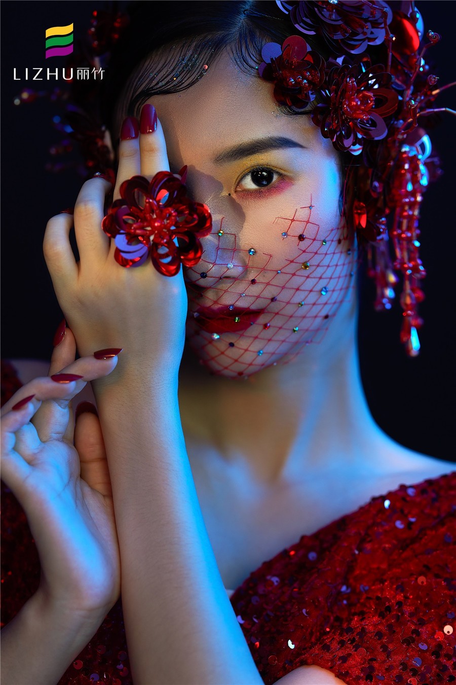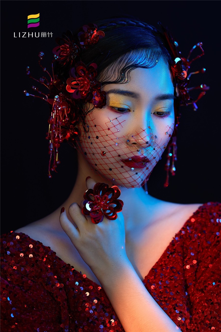 南寧化妝培訓(xùn)(麗竹化妝學(xué)校)作品---輕奢復(fù)古名媛造型:紅色亮片禮服搭配珠光感妝容,打造一種光澤細(xì)膩且高 級(jí)感的氣質(zhì),搭配半截珠片網(wǎng)紗神秘感十足,深邃眼妝透露魅惑的感覺。