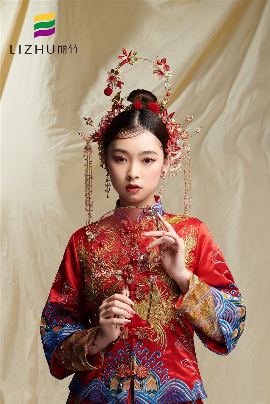 廣西彩妝培訓(xùn)學(xué)校(麗竹彩妝培訓(xùn)學(xué)校)---中式秀禾新娘造型:紅裳霞帔步搖冠,鈿瓔累累佩珊珊。金釵紅妝,一生一世中式溫婉,打造端莊秀氣優(yōu)雅中式新娘。