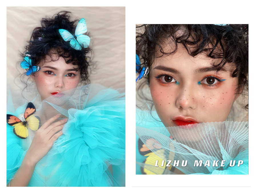 南寧彩妝學(xué)校作品分享---個性寫真制造型:蝴蝶頭飾與羊毛卷發(fā)型的組合,搭配今年大火的雀斑曬傷腮紅妝容,將嬌羞與純美展現(xiàn)無遺,甜美如晨間綻放的花蕾。