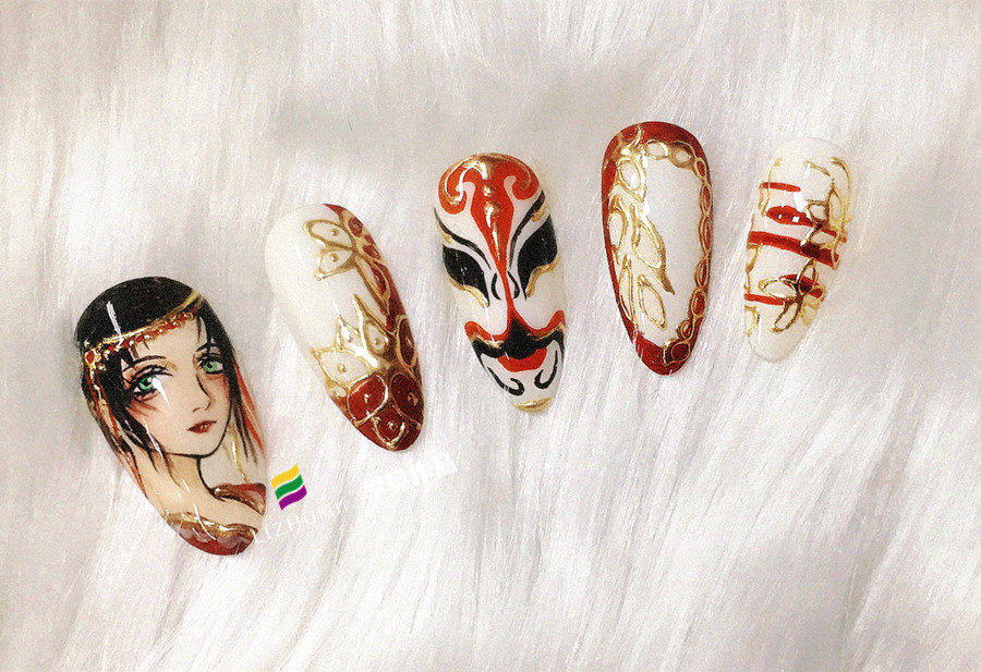 廣西美甲師培訓班-彩繪卡通美甲:以金黃色和中國紅為主的色彩基調,運用細膩流暢的線條勾畫翩翩起舞的舞者,以及國粹臉譜形象,再加上金邊點綴的花朵,好一副歌舞升平的盛世景象。喜歡挑戰(zhàn)高難度繪畫的小可愛們,可以挑戰(zhàn)這款哦!