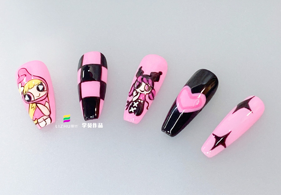廣西美甲學校排行榜-彩繪卡通美甲:你想過,當粉色和黑色相互碰面時能擦出怎樣的火花嗎?美甲的學員們就發(fā)揮自己的創(chuàng)意,將粉色奶瓶妹與黑色棋盤格及愛心等圖案進行組合搭配,為我們繪制出了一款不一樣的可愛風美甲。