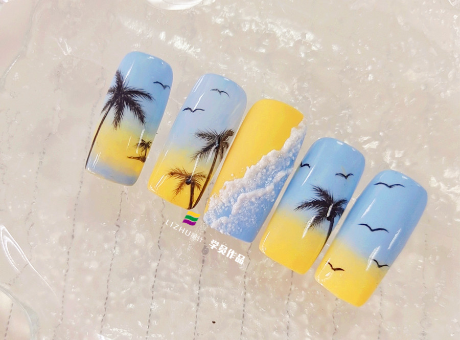 相信很少有人會不喜歡陽光,沙灘,大海的吧!郁郁蔥蔥的椰子樹佇立在海邊,陽光暖暖的照在細軟的沙灘上,沙子發(fā)出一閃一閃亮晶晶的光,仿佛一顆顆正在發(fā)光發(fā)亮的鉆石閃耀。俏皮的海星和貝殼沖上沙灘,給自己進行了一場陽光浴。高空飛翔的海鷗,則展開雙臂,自由盤旋在海面上,與海浪盡情嬉戲,好一副碧海藍天的愜意景象!既然去不了海邊,那么就把海邊美景畫在你的“指”上吧!