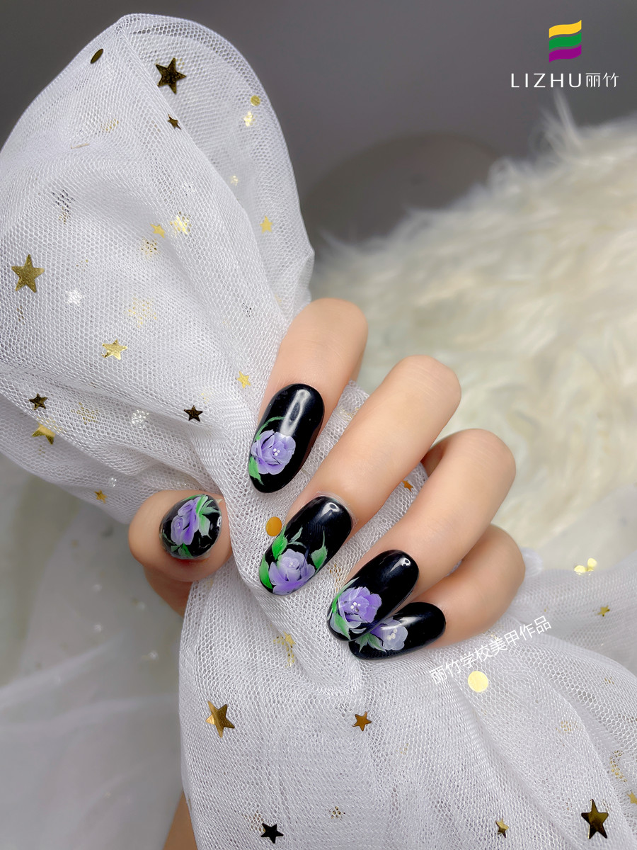 手繪玫瑰花美甲-全黑的底色上,描繪上芋泥紫的玫瑰花朵,在加以些許綠葉點綴,使得原本甜美的玫瑰花此時變得更加明艷且高貴。