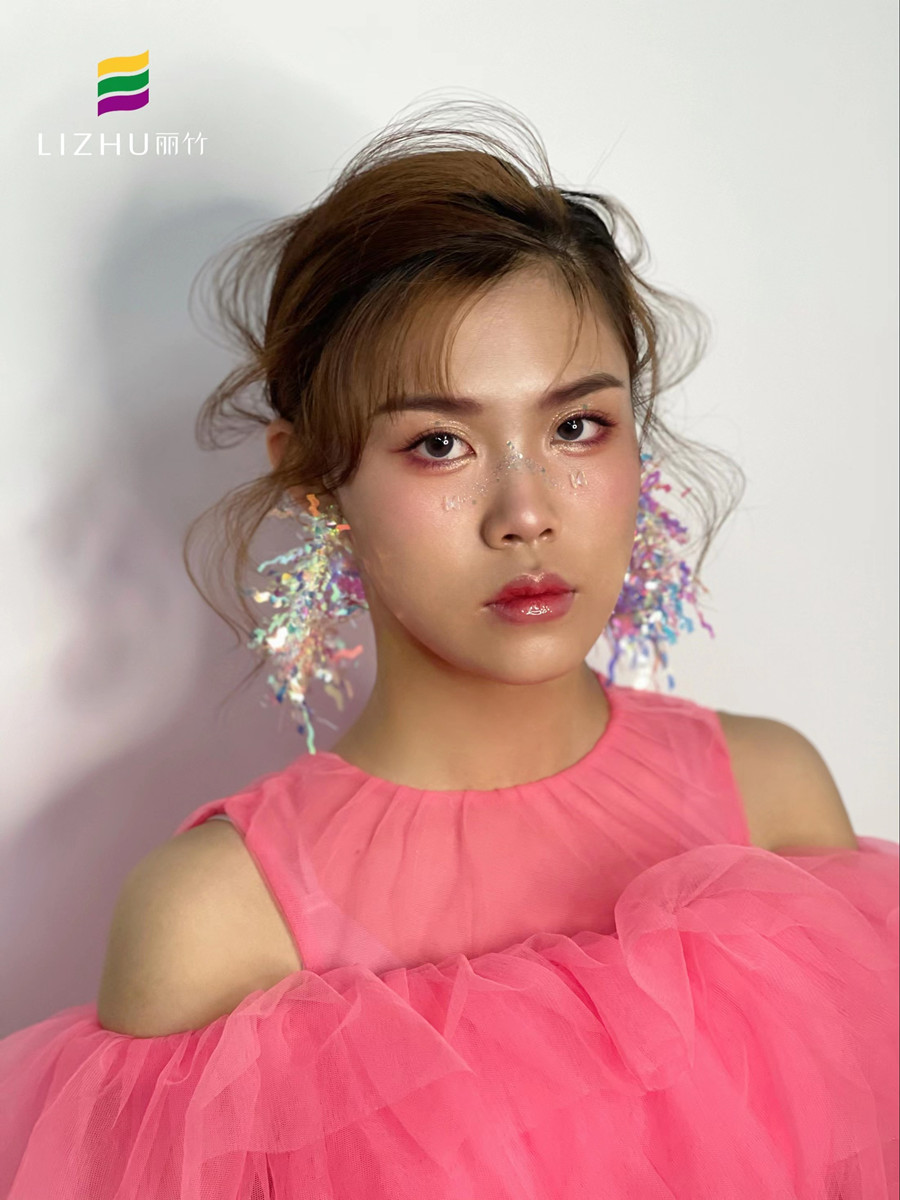 廣西彩妝化妝學校課堂作品---抽絲靈動造型:靈動飄逸的低髻抽絲盤發(fā),可鹽可甜的粉狀暈染,超大五彩亮片打造的耳飾,搭配粉色紗裙,滿屏皆是初戀的少女風。