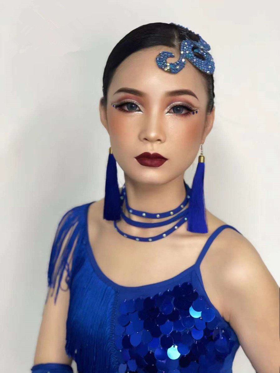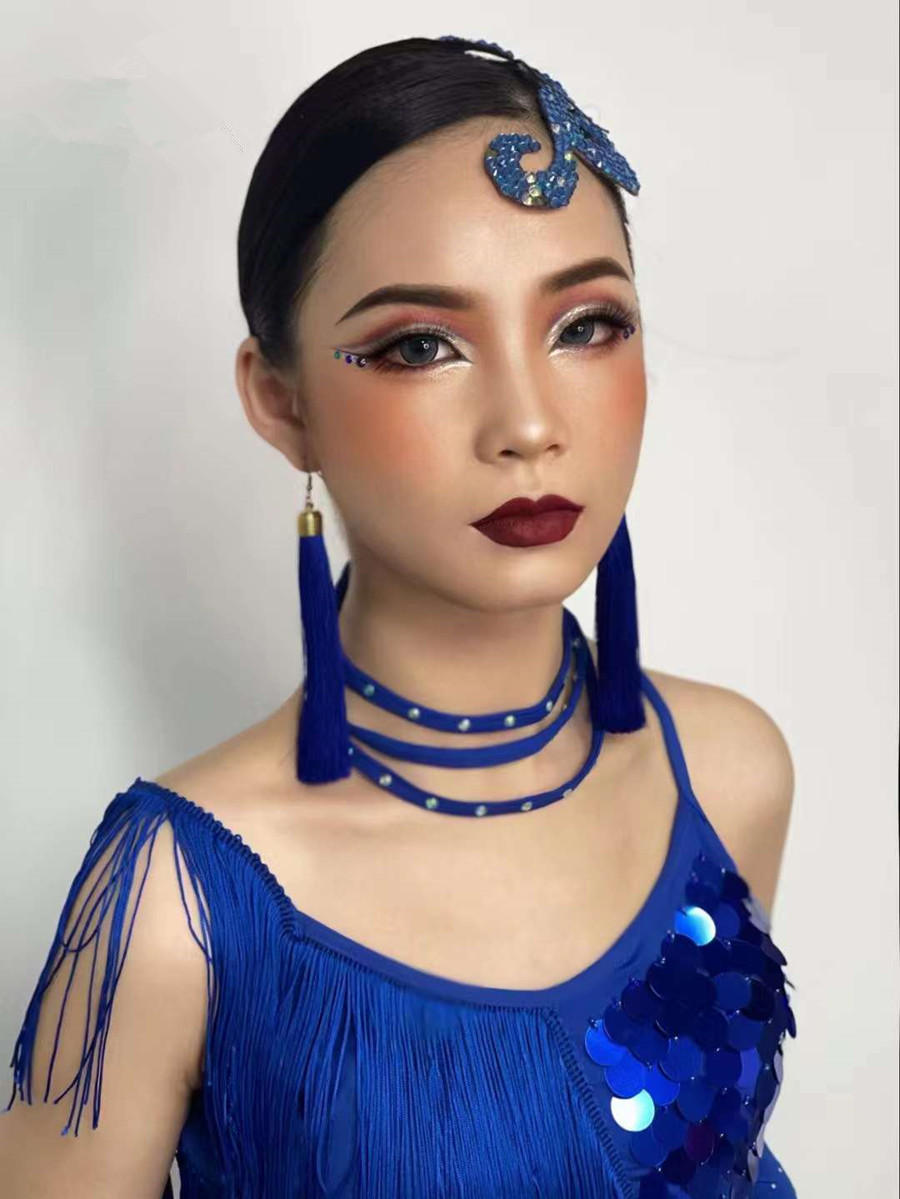 南寧學(xué)舞臺(tái)妝、南寧彩妝培訓(xùn)舞臺(tái)妝作品---拉丁舞妝:因?yàn)樘∥璧难輪T需要在聚光燈下,站在舞臺(tái)或是指定的場(chǎng)所表演,而觀眾又只能遠(yuǎn)距離觀看,所以在畫舞臺(tái)妝的時(shí)候,用到的色彩,特別是眼妝部分更加需要顏色艷麗的眼影去進(jìn)行有層次感的描繪,這樣才能讓妝容看起來(lái)更醒目。