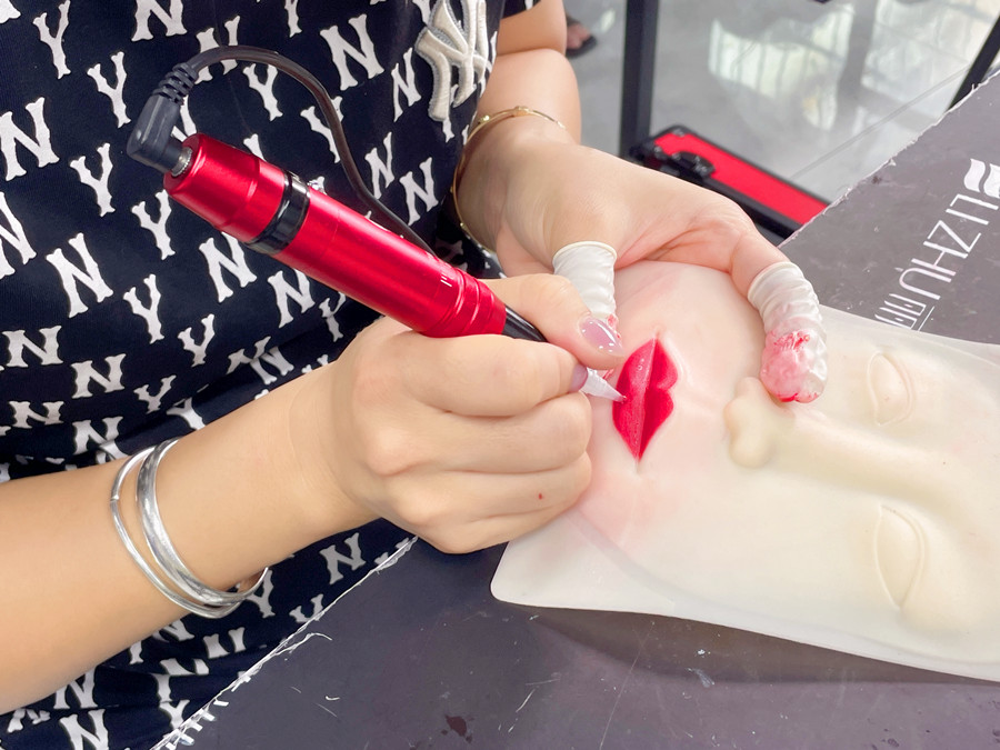零基礎學紋繡在廣西、廣西紋唇教學:經過前面對眉眼唇的理論以及紙上練習,廣西眉眼唇學校-麗竹眉眼唇學校的同學們從了解唇形的構造學起,再到紙上練習畫唇,現在進入到了仿皮紋唇練習。