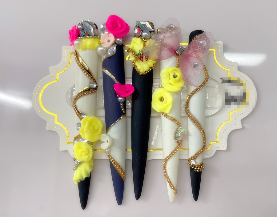 美甲師們?cè)谔貏e定制的長甲片上,通過采用彩繪,粘貼飾品,雕花,暈染等手法繪制出各種不同風(fēng)格的圖案。圖案的款式可以根據(jù)個(gè)人喜好而定,可以是彩繪水墨畫,輕奢復(fù)古的堆鉆款,也可以是充滿二次元的漫畫款……只要你喜歡,天馬行空任你畫。