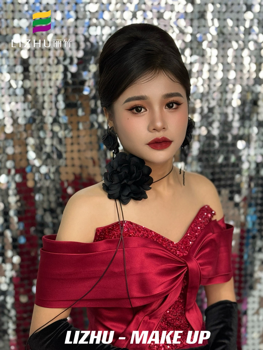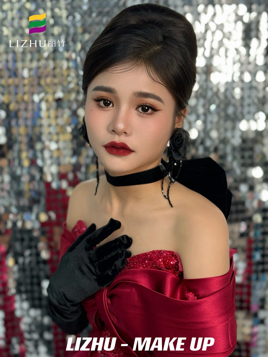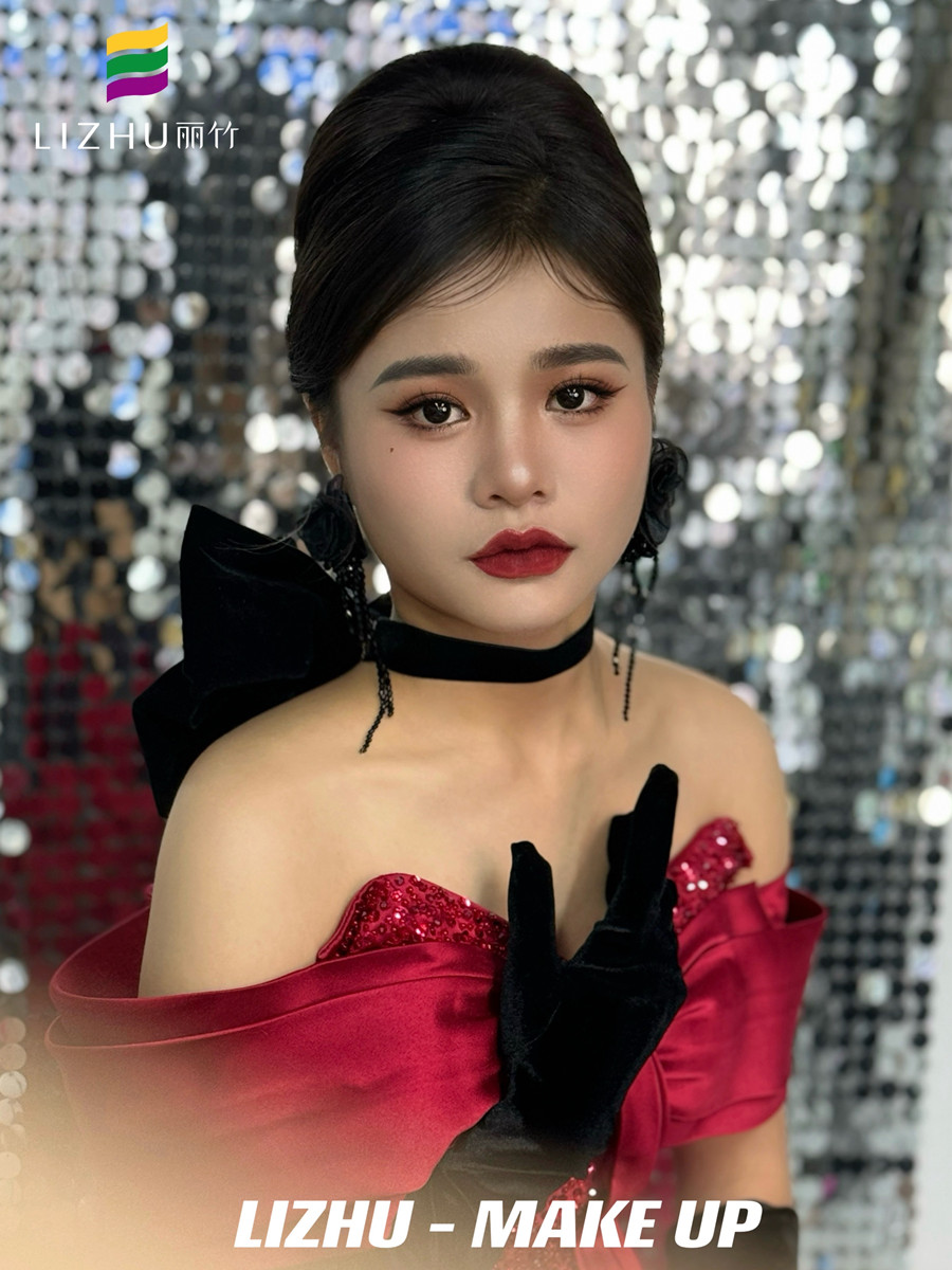 南寧化妝美業(yè)學(xué)習(xí)、南寧化妝彩妝(麗竹化妝彩妝培訓(xùn))作品---復(fù)古年會造型:明媚動人氣質(zhì)妝容,簡約大氣復(fù)古赫本發(fā)型,佩戴夸張黑色花朵配飾,身穿酒紅色亮片抹胸禮服,仿佛置身于年會中的紅玫瑰。想知道南寧化妝學(xué)校哪家時尚?或是想知道南寧學(xué)化妝學(xué)費便宜的是哪家?歡迎大家趁著麗竹學(xué)校正在進行招生優(yōu)惠活動之際,關(guān)注麗竹學(xué)校彩妝專業(yè),...