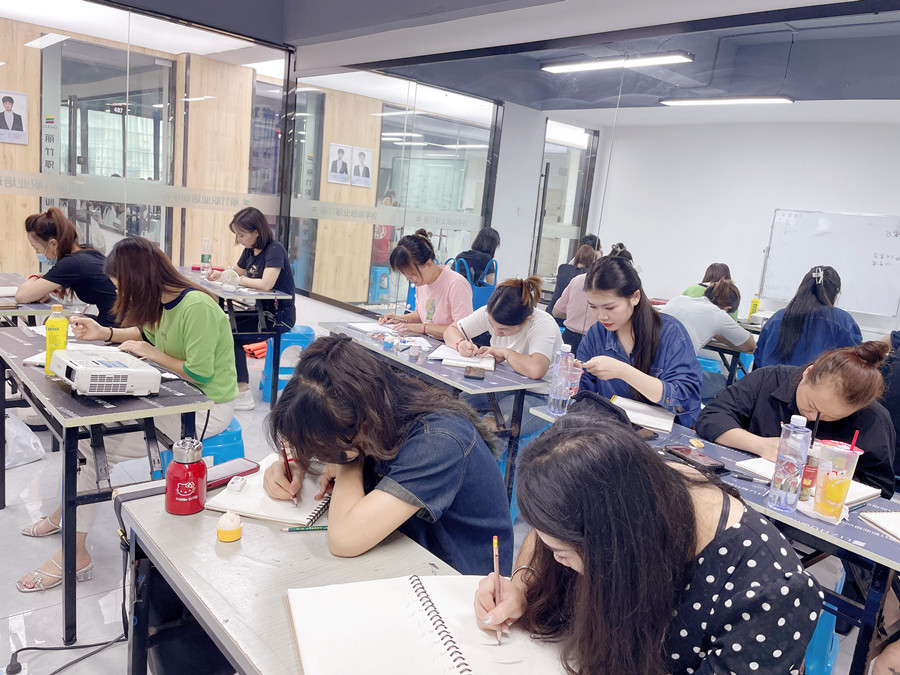 廣西紋繡課堂、學(xué)紋繡在廣西:廣西紋繡職業(yè)培訓(xùn)學(xué)校(麗竹紋繡學(xué)校)的廣西紋繡進(jìn)修課程---《眉眼唇大師班》正在如火如荼進(jìn)行中。在了解完紋繡的一些基本知識后,同學(xué)們在老師的指導(dǎo)下進(jìn)入到了紙上畫眉的練習(xí),為后期進(jìn)行真人實操設(shè)計眉形做準(zhǔn)備。
