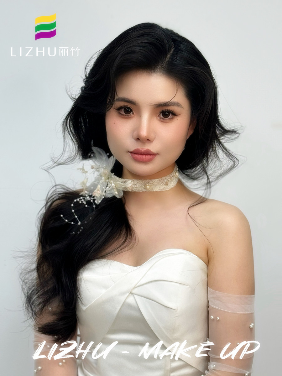 廣西學(xué)化妝影樓、廣西寫真化妝,廣西新娘妝跟妝培訓(xùn)(麗竹寫真化妝培訓(xùn))--- 韓式側(cè)扎紋理新娘:氧氣清新的自然無痕妝容,優(yōu)雅隨意的紋理韓式卷發(fā),白色蕾絲珠花頭飾側(cè)扎發(fā),打造氣質(zhì)滿滿的元?dú)饷郎倥?