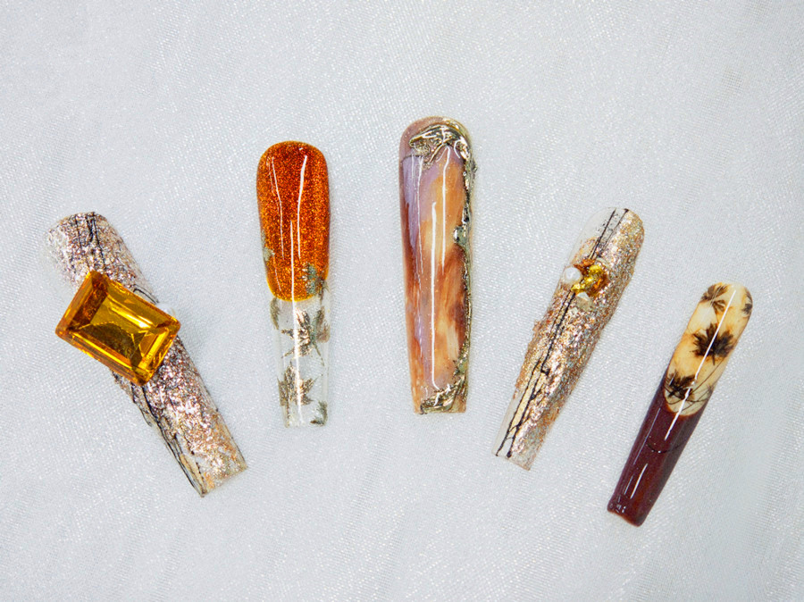 廣西美甲課堂實訓、廣西美甲培訓實操:整副作品主要是以暈染技術和水晶砂礫共同打造而成。以透明底作為底色,用暈染液打造出的琥珀色的圖案營造出夕陽的氛圍感。再用水晶砂和金箔紙繪制出楓葉,暈染出落日般的晚霞,整體視覺營造出了一種非常低調、優(yōu)雅、夢幻的精致感。