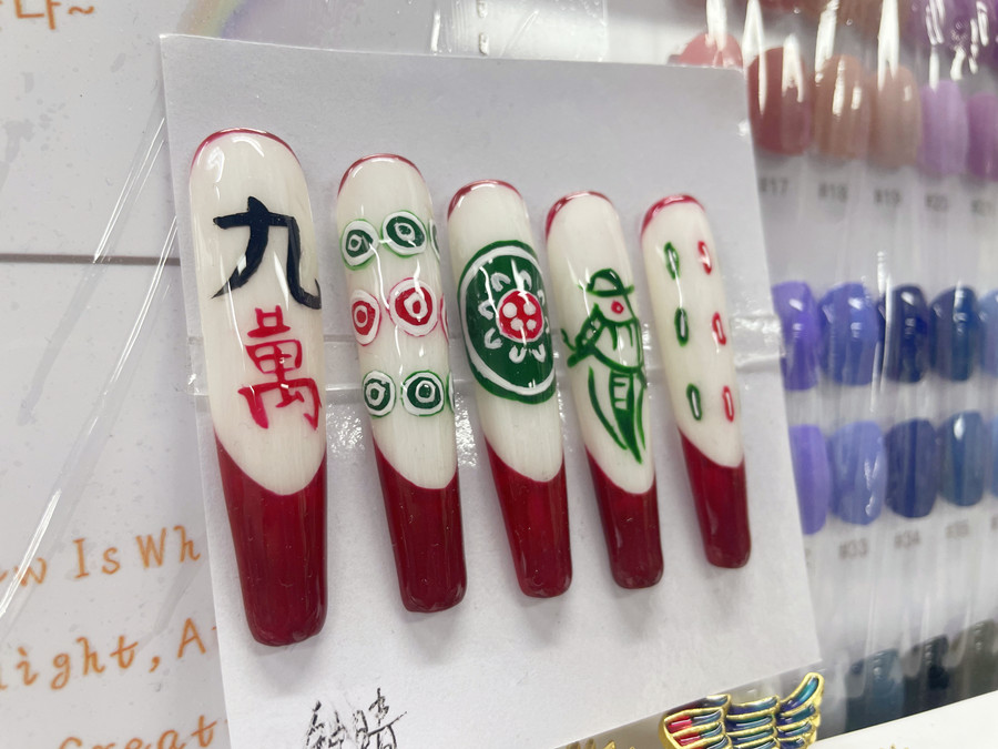 南寧美甲訓(xùn)練、南寧美甲作品:面對成千上萬款美甲,身為美甲控的你想好給自己做什么款式的美甲了么?如果還沒有,南寧美甲職業(yè)學(xué)校推薦你可以可以試試南寧美甲造型進(jìn)修班同學(xué)們繪制的畢業(yè)作品。這便是新年里建議大家一定要嘗試做的美甲款式---麻將美甲。