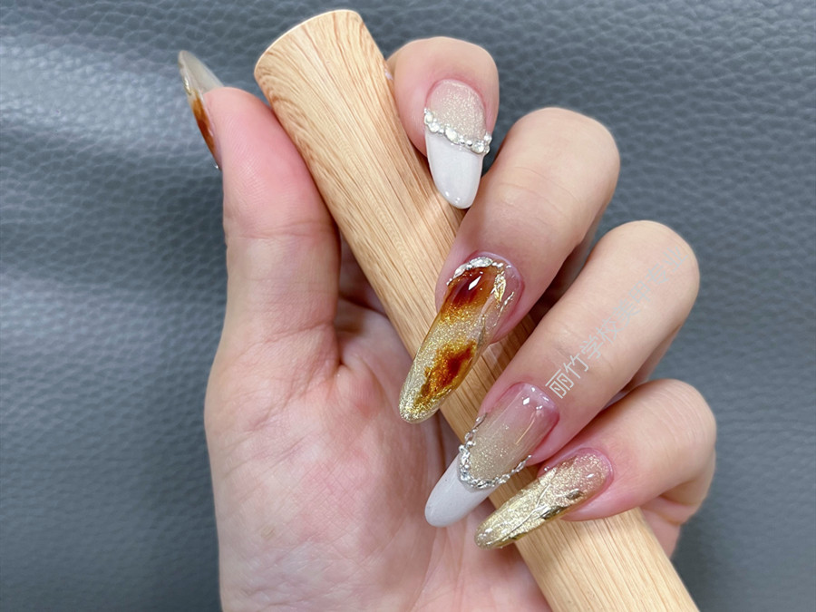 廣西美甲訓(xùn)練、廣西美甲職業(yè)教育:作品主要以貓眼膠作為主題繪制。以棕色暈染起到點睛之筆的作用,然后在指尖勾畫出法式風(fēng)格的微笑弧線,然后用白色彩繪膠進行填充,之后在粘貼碎鉆進行裝飾,使得整副美甲作品變得更加高雅和精致。