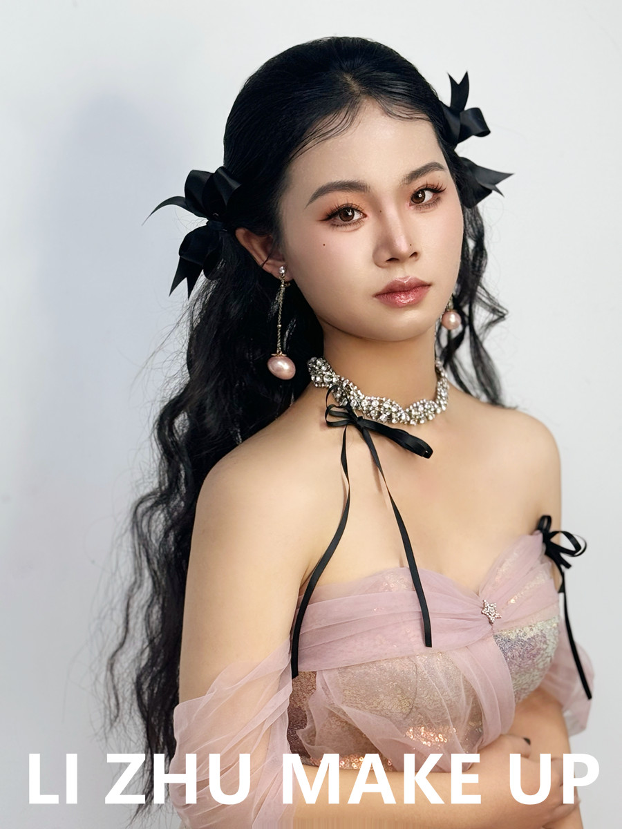 南寧化妝形象設(shè)計、南寧學(xué)化妝零經(jīng)驗、南寧化妝培訓(xùn)進修提升(麗竹化妝造型學(xué)校)作品---韓式甜美新娘:自然服貼的韓式底妝,粉橘色亮眼的眼妝和唇妝,成套蝴蝶結(jié)飾品點綴,讓身著粉色紗質(zhì)禮服造型更加甜美。