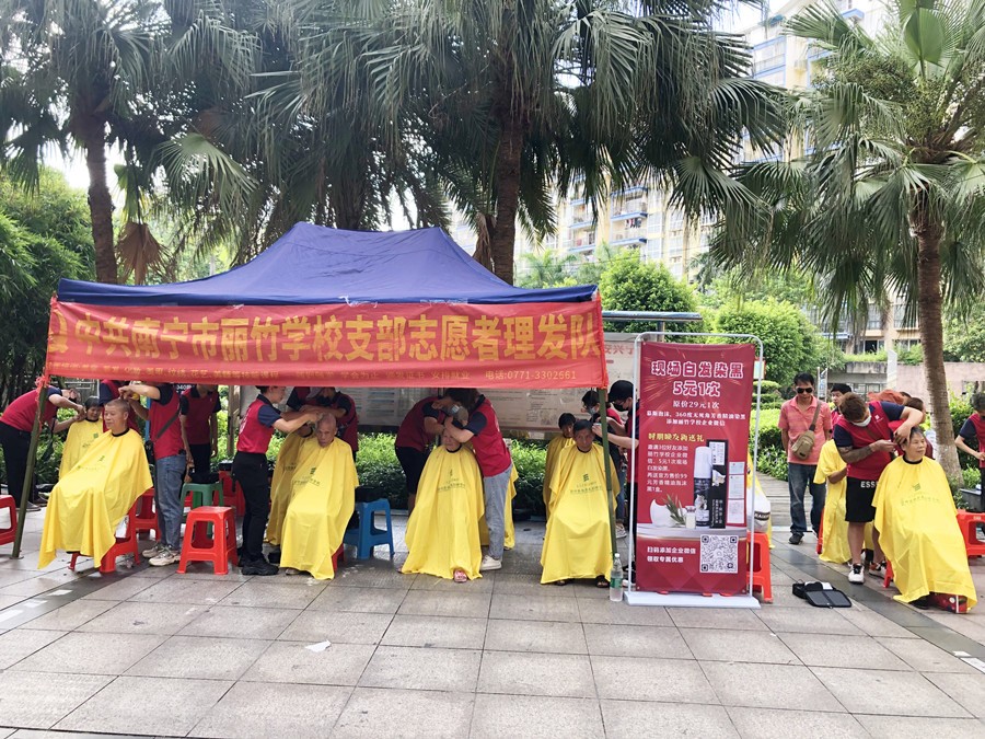 南寧美發(fā)學(xué)校公益進(jìn)社區(qū)、南寧美發(fā)社會實踐培訓(xùn):中共南寧市麗竹學(xué)校支部志愿者理發(fā)隊(南寧美發(fā)志愿者服務(wù)隊-南寧美發(fā)培訓(xùn)班)為了真正將惠民服務(wù)落實到群眾身邊,現(xiàn)在只要到活動現(xiàn)場,不僅可以免費理發(fā),還可以體驗“白染黑”項目哦