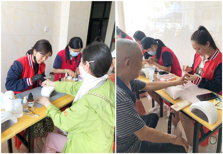 活動(dòng)現(xiàn)場(chǎng),雖然來(lái)的都是叔叔阿姨,爺爺奶奶,但愛(ài)美之心人皆有之。同學(xué)們每操作一個(gè)步驟,都會(huì)很耐心地為大家進(jìn)行解釋。即使現(xiàn)場(chǎng)條件有限,但同學(xué)們還是認(rèn)真地為大家修剪死皮,打磨甲形,拋光甲面,涂抹單色等項(xiàng)目。而居民也用手機(jī)記錄下了這次難得的美甲體驗(yàn),現(xiàn)場(chǎng)氣氛十分熱烈。