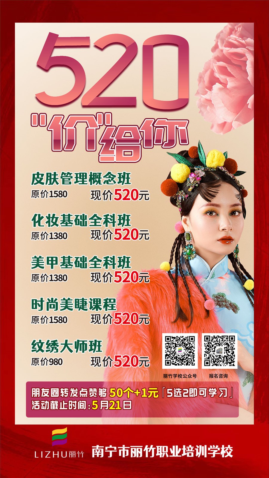 麗竹學(xué)?!?20告白季”重磅推出5大“美麗護(hù)膚系列”課程,原價(jià)值3160元的培訓(xùn)項(xiàng)目,轉(zhuǎn)發(fā)朋友圈點(diǎn)贊集50個(gè) + 截圖保存,只需520+1元,即可從5門課程選2門學(xué)習(xí)?;顒?dòng)時(shí)間為:5月20日當(dāng)天報(bào)名的29個(gè)名額