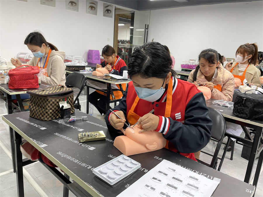 學(xué)員在假頭模進(jìn)行嫁接睫毛練習(xí)