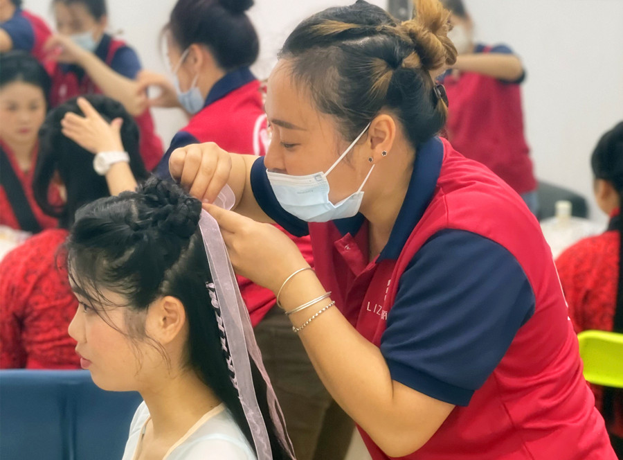 除了妝容的難度,在學習發(fā)型課程時,我也覺得困難重重。比如,在做秀禾發(fā)型卷筒的操作時,卷著卷著就突然不知道該如何收尾?又或者是做完后一看,才發(fā)現(xiàn)做出的形狀和老師的不一樣,不僅沒有美觀度,而且還松塌。然后在做赫本包時,倒梳頭發(fā)沒到位,每次倒梳之后捋順赫本包又變小了。披發(fā)兩邊方向燙的不一致……