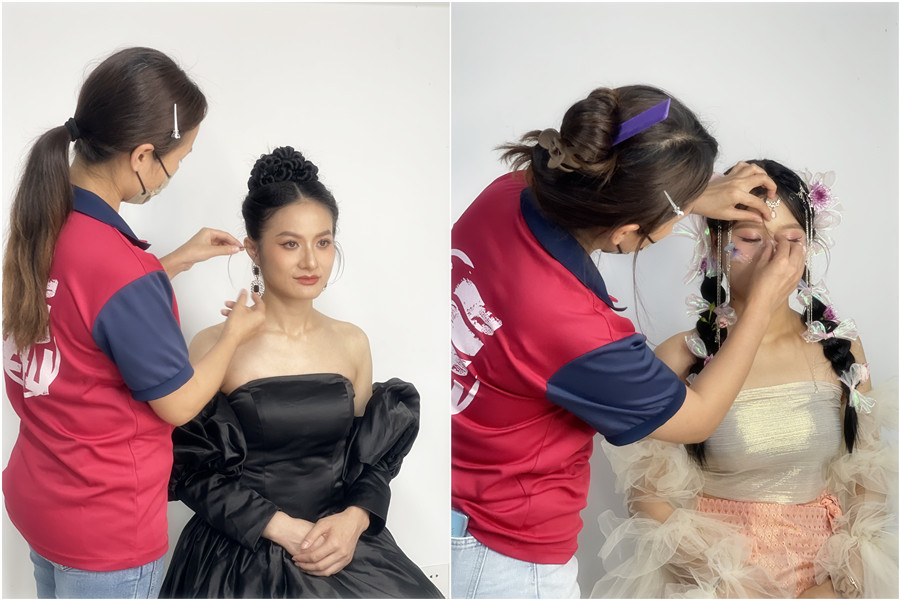 但是后面進班試聽了一節(jié)課后,我發(fā)現(xiàn)老師在課堂上的教學內(nèi)容不僅正是我想學的,課堂氛圍也十分活躍,就這樣我就直接全款報讀了化妝專業(yè),隔天就來上課了?;瘖y專業(yè)分為三個階段,從基礎妝面(化妝基礎班)開始,再到時尚發(fā)型(盤扎發(fā)造型班)以及整體妝造(新娘時尚造型班)進行學習。