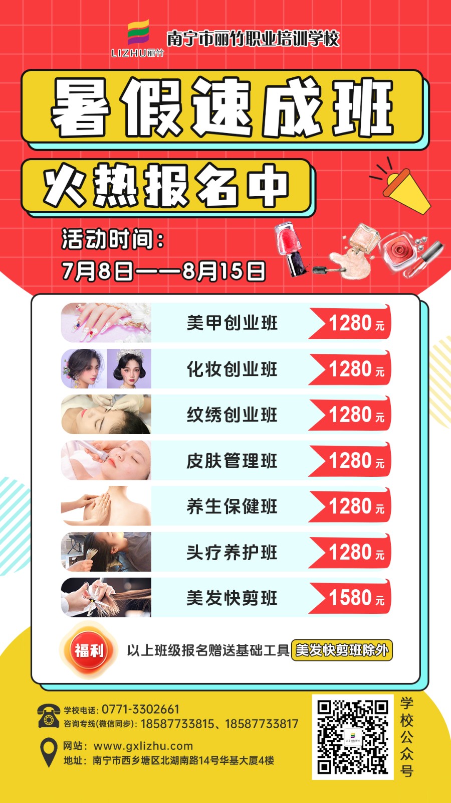 如果你想在廣西學(xué)美容美發(fā),想知道廣西化妝美甲學(xué)費(fèi)多少?想知道廣西紋繡去哪學(xué)……那就千萬(wàn)不要錯(cuò)過(guò)廣西美容美發(fā)化妝美甲(麗竹學(xué)校)暑假速成班推出的課程報(bào)名活動(dòng)啦!